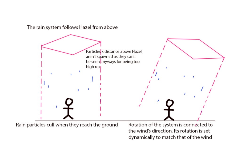 The first iteration, as I was told, worked a bit closer to the current system. Instead of the rain coming from above Hazel, it was a cylinder of rain that travelled together with her. The second iteration worked very differently: it tiled rain across the map; different tiles would activate based on where Hazel was at any given time. It also had a depth masking feature for rain that was supposed to help cull the rain when under roofs and ceilings.